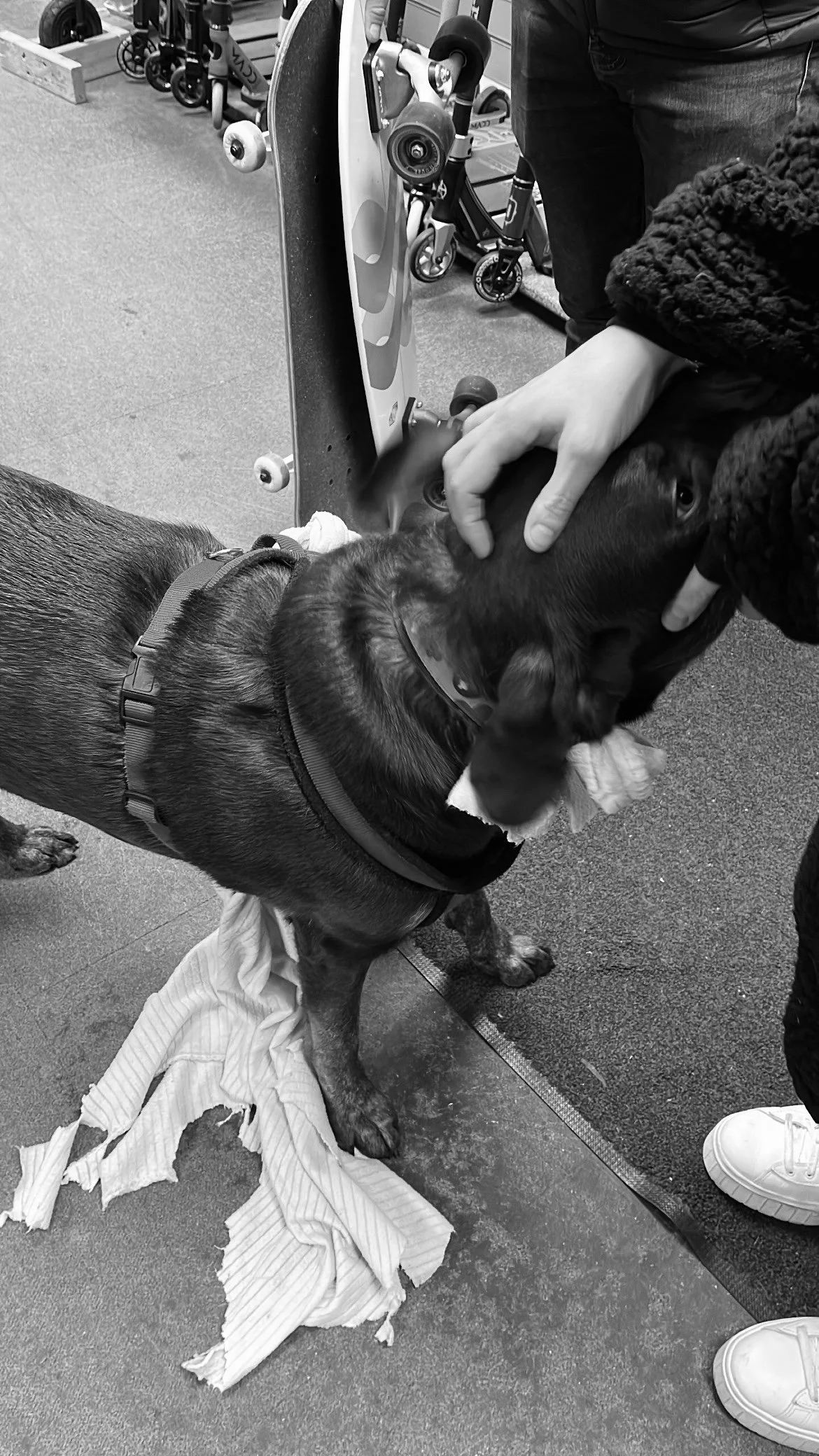 With the blanket in Patches mouth we had our briefing session in the Skate shop around what to expect and the equipment we would need. Afterwards we then headed through the shop and into the skate park.